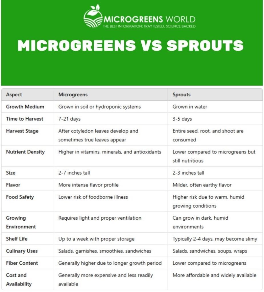 | Safety Considerations | Microgreens grown in soil or controlled environments generally carry fewer microbial risks than sprouts, which are susceptible to contamination during sprouting. |